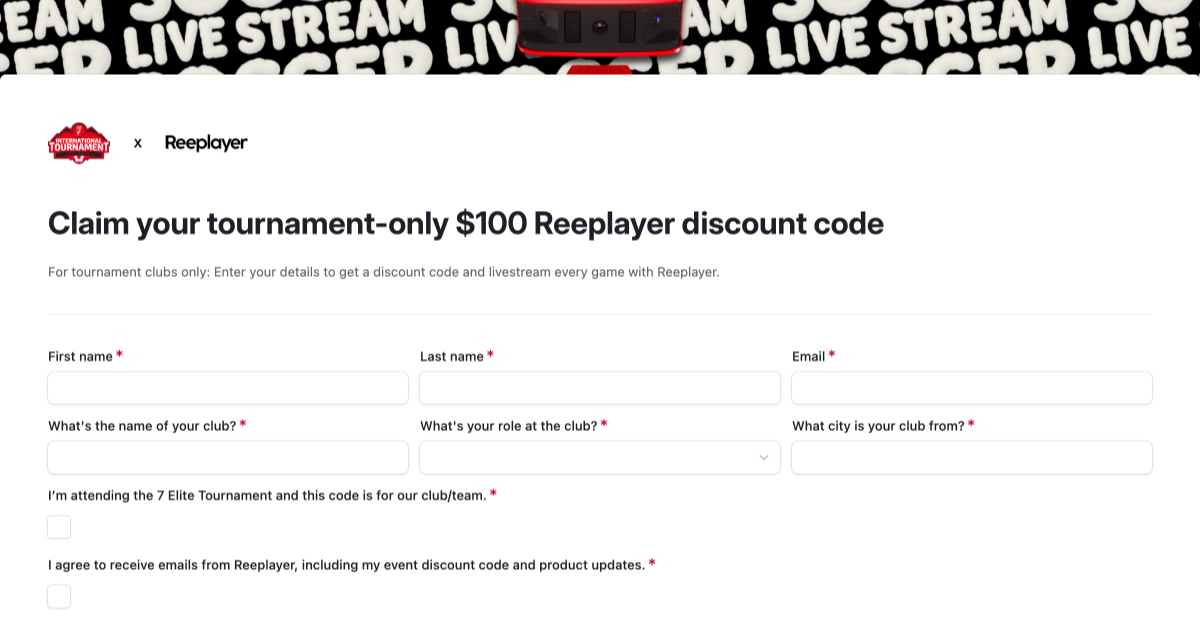 For tournament clubs only: Enter your details to get a discount code and livestream every game with Reeplayer.